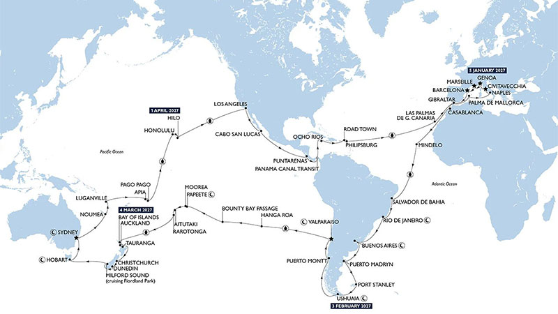 Avgång den 4 januari 2027 och kryssningen avslutas 5 maj 2027.